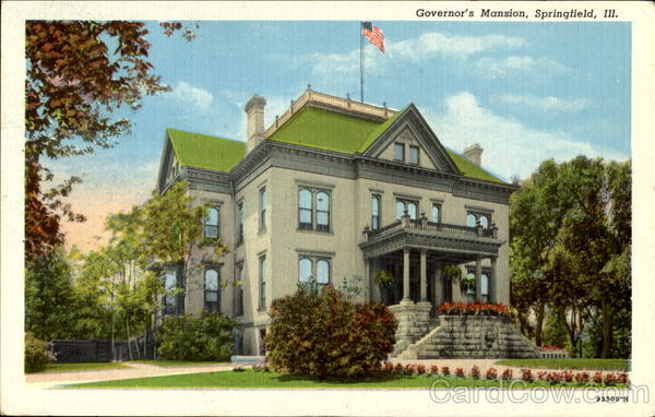 Front: Governor's Mansion, Springfield, Ill. 93508-N Back: H. N. SHONKWILER, EXCLUSIVE DISTRIBUTOR, SPRINGFIELD, ILL. Illinois Pawnee Cau Tho POST 12 9 Ill. Chicago vo Leona II 1950 5 PM JANIT PAN SINCE