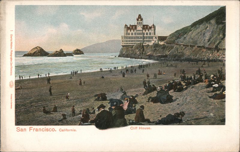 View of the Cliff House hotel on a cliff overlooking a crowded beach with many people and rock formations in the Pacific Ocean.