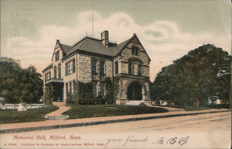 Exterior view of the stone Memorial Hall in Milford, Massachusetts, featuring an arched main entrance, gabled rooflines, and chimneys.