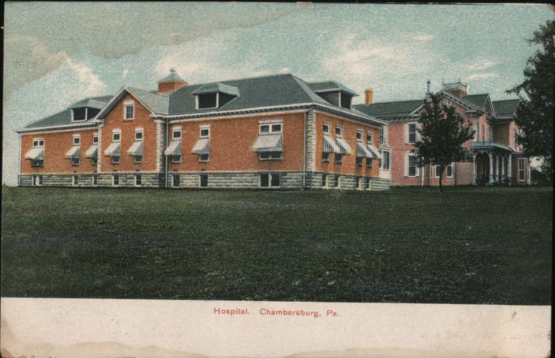 Exterior view of a large brick hospital building with a grassy lawn in the foreground. The building features multiple windows with striped awnings, and another building is visible in the background to the right.