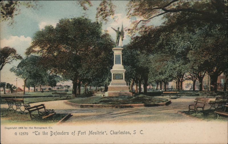 Monument dedicated to the defenders of Fort Moultrie, situated in a park with trees and benches.