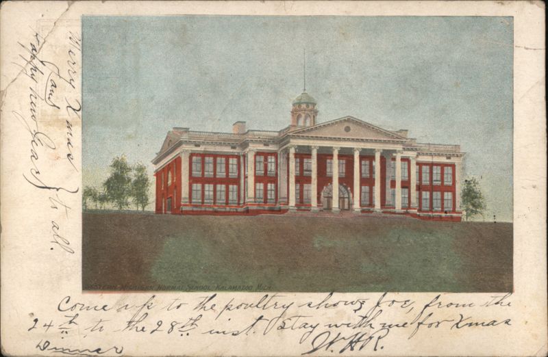 | View of the Western Normal School building. Handwritten message on the front invites "Joe" to a poultry show from the 24th to the 28th and to stay for Christmas dinner, signed J.H.R. Another message reads "Merry Xmas and Happy New Year to all." |