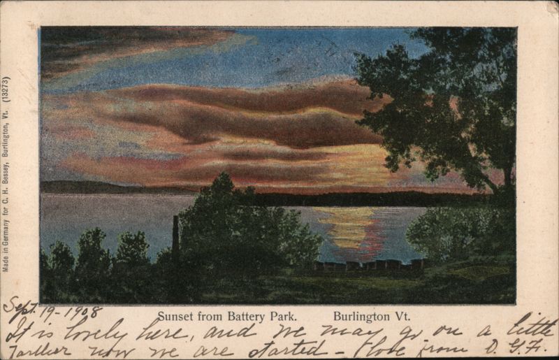 A colorful depiction of a sunset over a lake, as seen from Battery Park. The sun's reflection shimmers on the water, with silhouetted trees and park benches in the foreground.