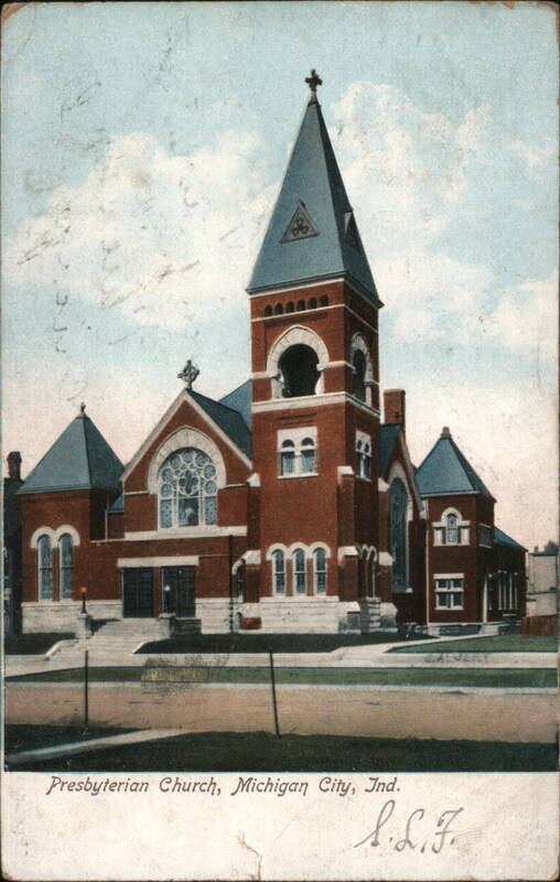 Exterior view of the Presbyterian Church in Michigan City, Indiana, featuring a prominent central tower with a steeple, arched windows, and stained glass.