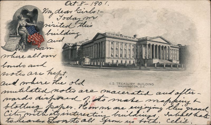 View of the U.S. Treasury Building. Handwritten message from Celie dated Oct. 8, 1901, describes visiting the building, seeing where bonds and notes are kept, and how old mutilated notes are macerated to make mapping and blotting paper. A vignette shows an eagle and a woman with an American flag with the text 'Greetings from Picturesque America'. |