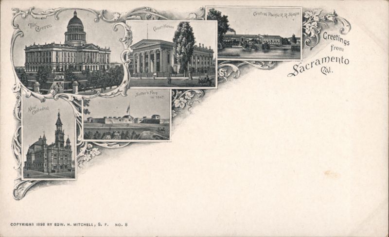 Multi-view of Sacramento landmarks: The Capitol, Court House, Central Pacific R.R. Shops, New Cathedral, and Sutter's Fort in 1847.
