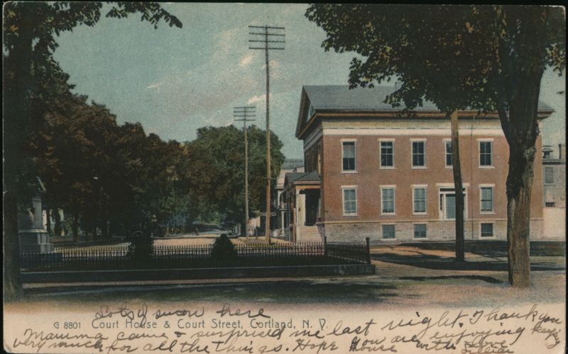 View of the Court House and Court Street in Cortland, New York. The scene depicts winter with snow-covered ground, bare trees, and utility/trolley poles with tracks on the street.
