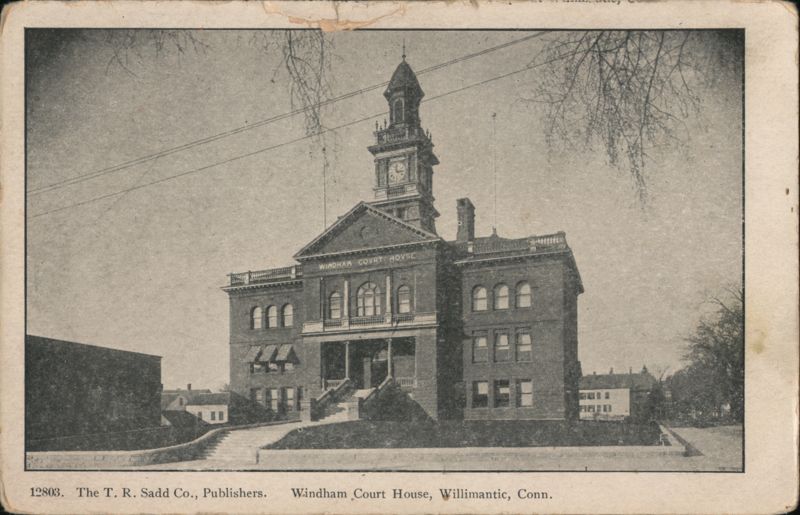 Exterior view of the Windham Court House, a prominent building with a clock tower and a gabled roof.
