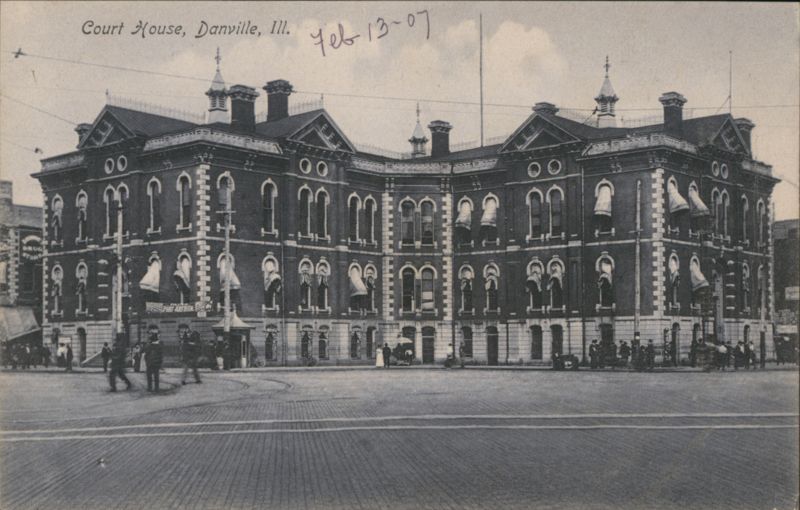 Exterior view of the Danville Court House with people and horse-drawn carriages on the street in front.