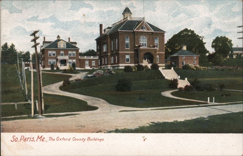 View of the Oxford County Buildings in South Paris, Maine, showing multiple structures with winding paths and landscaping.