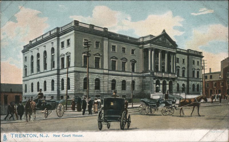 | Exterior view of the New County Court House in Trenton, New Jersey, featuring classical architecture, with horse-drawn carriages and pedestrians on the street in front. The back of the card states it cost $300,000 and was considered one of the finest edifices of its kind in the State. |
