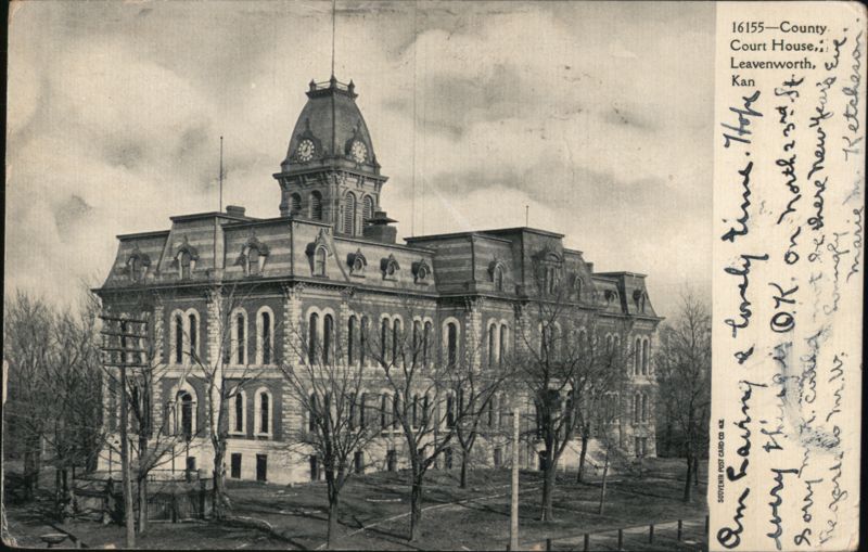 Exterior view of the Leavenworth County Court House, a large building with a prominent central clock tower, surrounded by bare trees.