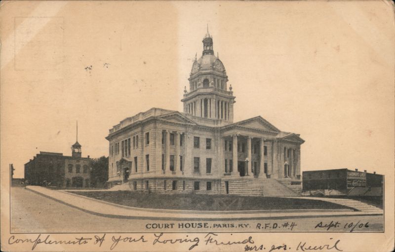 | View of the Bourbon County Courthouse in Paris, Kentucky, a classical revival style building with columns, a pediment, and a central dome. A curved road is in the foreground. A smaller building is visible to the left, and another commercial building with a sign (partially reading "GARDNER'S") is to the right. Dated September 10, 1906 on the front. |