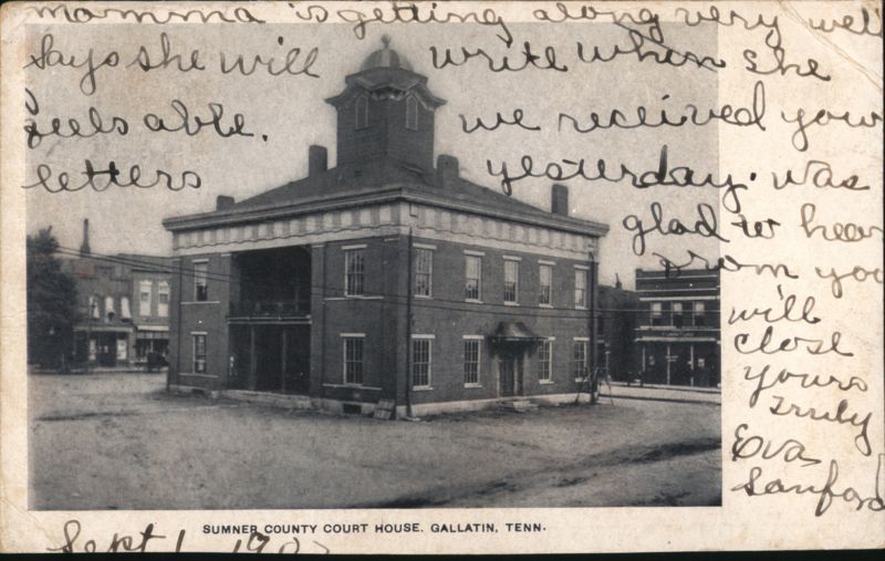 Exterior view of the Sumner County Court House in Gallatin, Tennessee. The two-story brick building features a prominent central tower, a classical entablature, and a covered second-story porch. Other period buildings are visible in the background along an unpaved street. A handwritten message from 'Eva Sanford' dated 'Sept 1 1907' is on the front. |