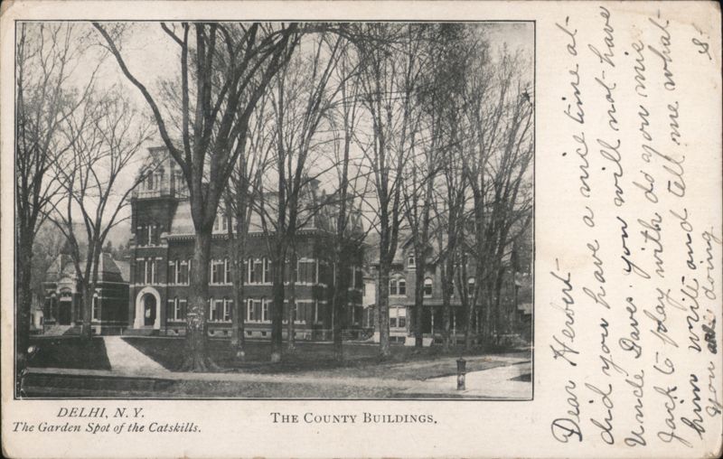 View of The County Buildings in Delhi, New York, described as "The Garden Spot of the Catskills." The image shows a large institutional building with a central tower, surrounded by bare deciduous trees.