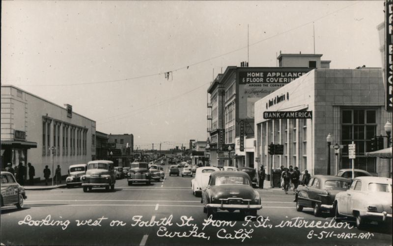 Street view looking west on Fourth Street from the F Street intersection, showing mid-century automobiles and businesses including Bank of America.