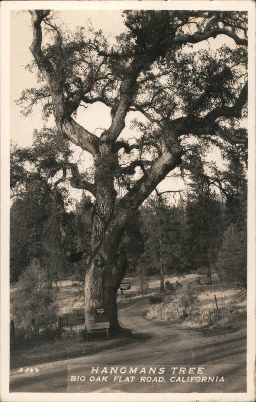 A large, gnarled oak tree, identified as the 'Hangmans Tree', stands beside a dirt road. A wooden bench is placed at the base of the tree. The location is specified as being on Big Oak Flat Road in California.