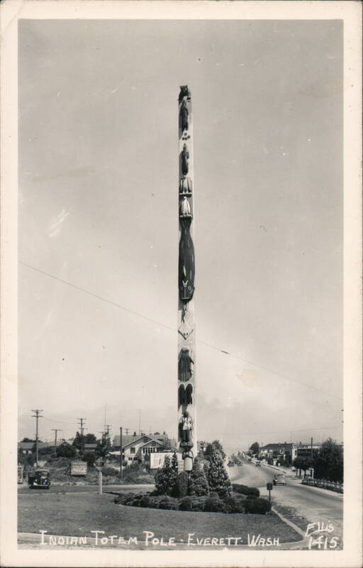 A tall, intricately carved totem pole stands in a grassy median or park area beside a road. Houses, utility poles, and early model cars are visible in the background.