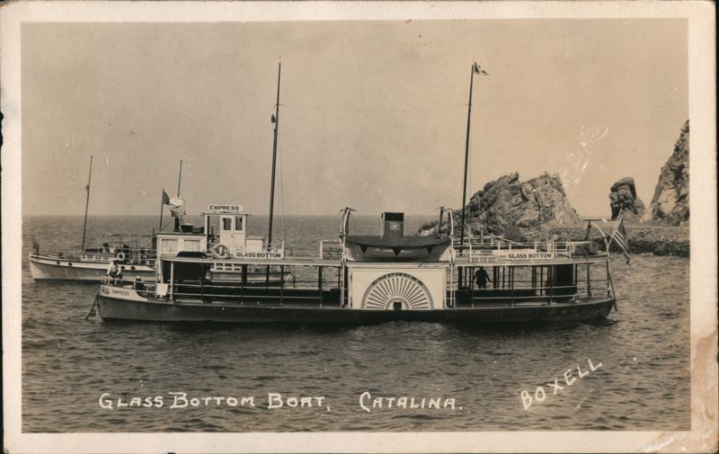 Paddle steamer 'EMPRESS' offering glass bottom boat tours at Catalina. Another smaller vessel is visible to the left, with rocky cliffs in the background. The name 'BOXELL' is printed on the lower right.