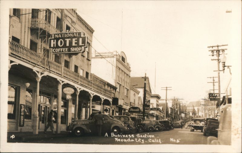 Street view of a business section in Nevada City, California, featuring the National Hotel and Coffee Shop, with several vintage cars from the 1930s-1940s parked along the street.