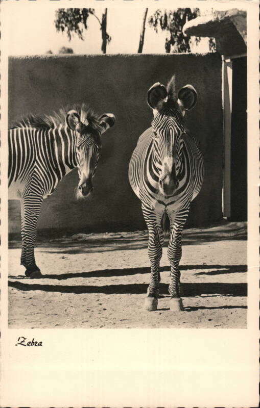 Two zebras stand in an outdoor enclosure with a dirt ground and a high wall in the background. One zebra is in profile, the other faces forward.