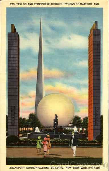 Front: F113:-TRYLON AND PERISPHERE THROUGH PYLONS OF MARITIME AND TRANSPORT COMMUNICATIONS BUILDING, NEW YORK WORLD'S FAIR Back: "N.Y.W.F. LIC. 2965" Officially Licensed NEW YORK WORLD'S FAIR CUP © NYWE MADE IN U, S. A. 45355