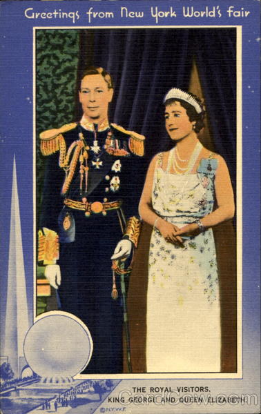 Front: Greetings from New York World's fair THE ROYAL VISITORS, KING GEORGE AND QUEEN ELIZABETH. ONY.W.F Back: NEW YORK WORLD'S FAIR Ne Officially Licensed n.y.w.F. LIC.2965. ©ny.W.F. MILLER ART Co. Inc. BROOKLYN n.4.