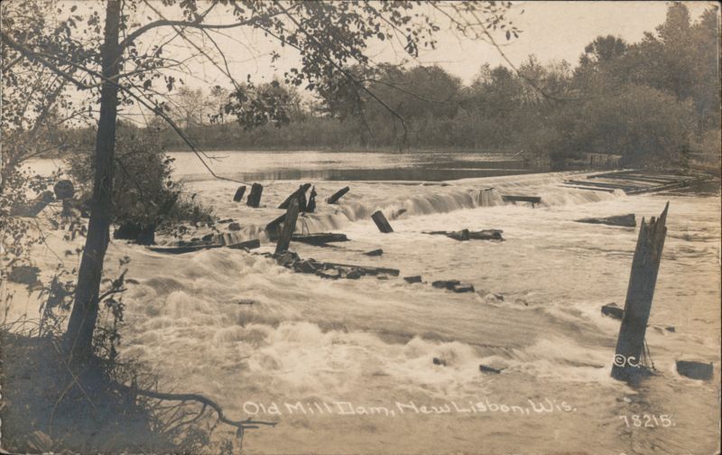 View of the Old Mill Dam on a river in New Lisbon, Wisconsin, with water flowing over the structure and remnants of wooden supports.
