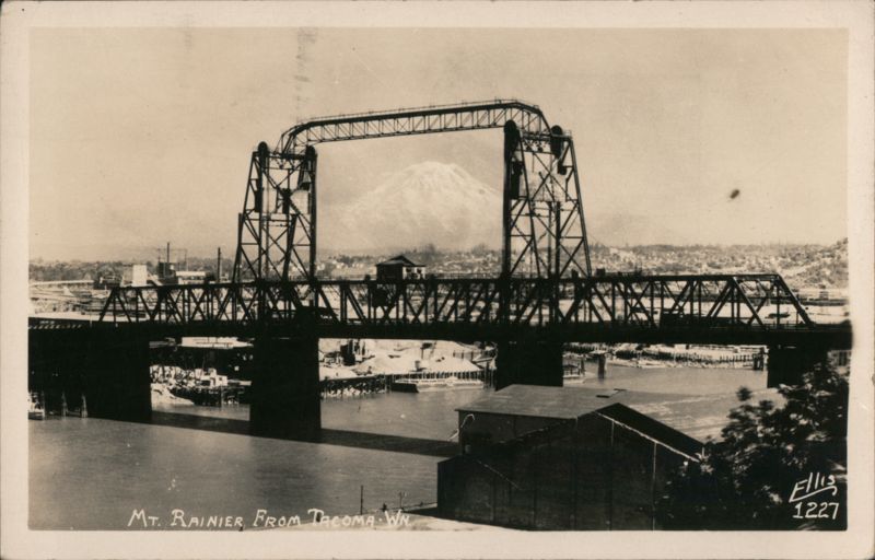 | View from Tacoma, Washington, looking towards a snow-capped Mount Rainier in the distance. A large steel truss vertical lift bridge spans a waterway in the foreground, with parts of the city visible. Smaller boats are present in the waterway. |