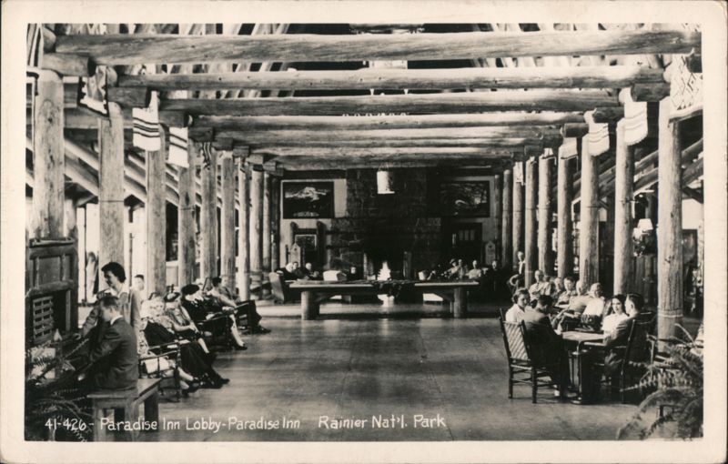 Interior view of the rustic lobby of Paradise Inn, showing guests seated around a large fireplace and at tables. The room features prominent log beams and columns.