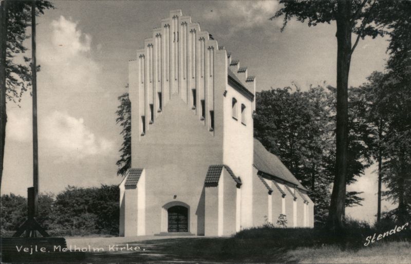 Exterior view of Mølholm Church in Vejle, featuring its distinctive stepped gable tower.