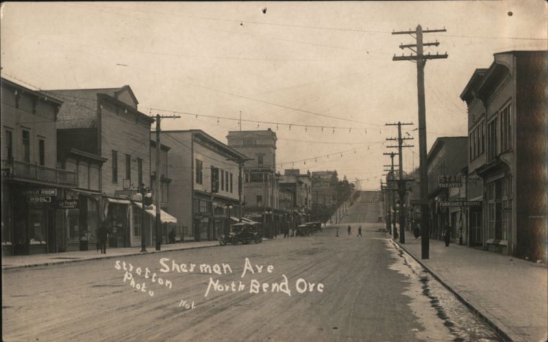 | View looking uphill on Sherman Avenue, a dirt road in North Bend, Oregon. Wooden-sided commercial buildings line both sides of the street, with signs for "LUNCH ROOM POOL," "La French," "STAR THEATRE," and "FURNISHED ROOMS." Numerous utility poles and overhead wires are visible. Several early automobiles are parked or moving on the street, and a few pedestrians are seen in the distance. Handwritten text "Stratton Photo No. 1" is at the bottom left. |