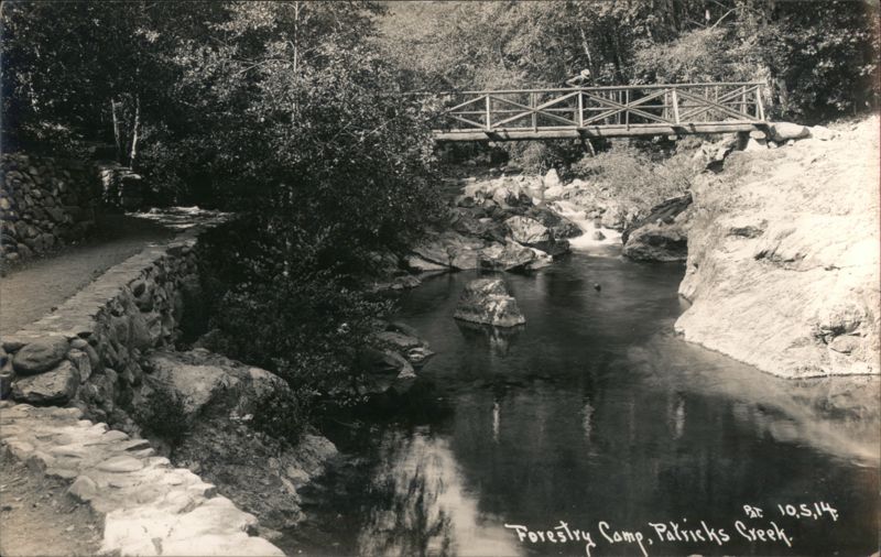 A rustic wooden bridge spans Patricks Creek at a Forestry Camp. A stone-lined path follows the creek bank, surrounded by dense forest. Text on image: 'P.C. 10,5,14'.