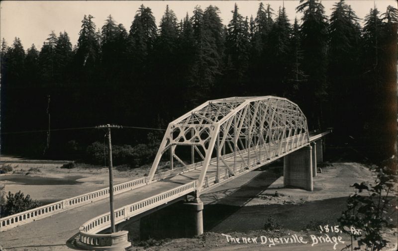 View of a steel truss arch bridge, identified as the new Dyersville Bridge, spanning a river or dry bed, with a forest in the background. A utility pole is visible on the left approach to the bridge.