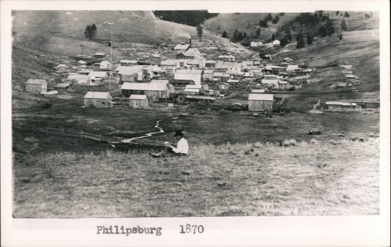 Panoramic view of the town of Philipsburg nestled in a valley, circa 1870. Wooden structures are spread across the landscape, with a lone figure seated on a grassy hillside in the foreground.