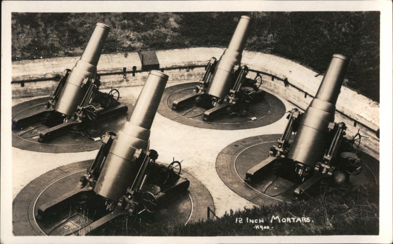 Four large 12-inch mortars arranged in a circular battery emplacement.