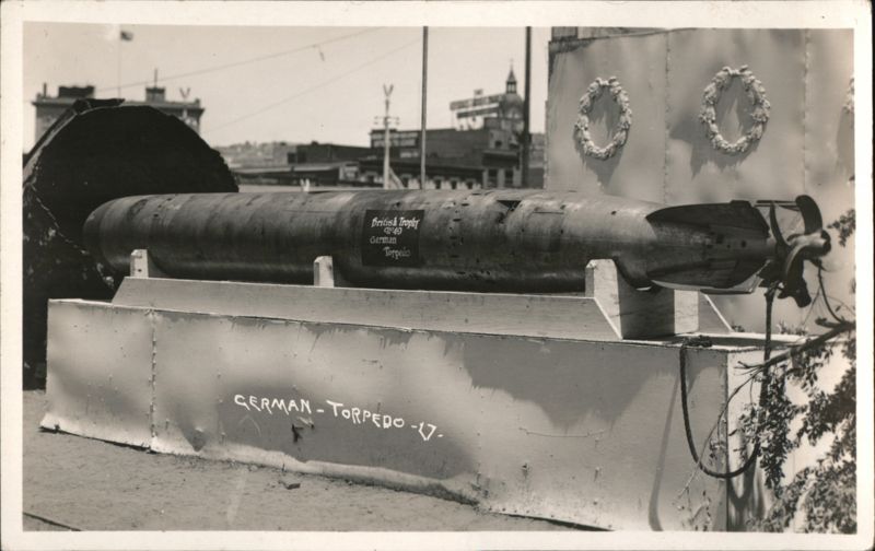 A German torpedo, designated as British Trophy No. 89, is displayed on a stand. The stand is labeled "GERMAN - TORPEDO - 17 -". In the background, two wreaths are visible on a wall.