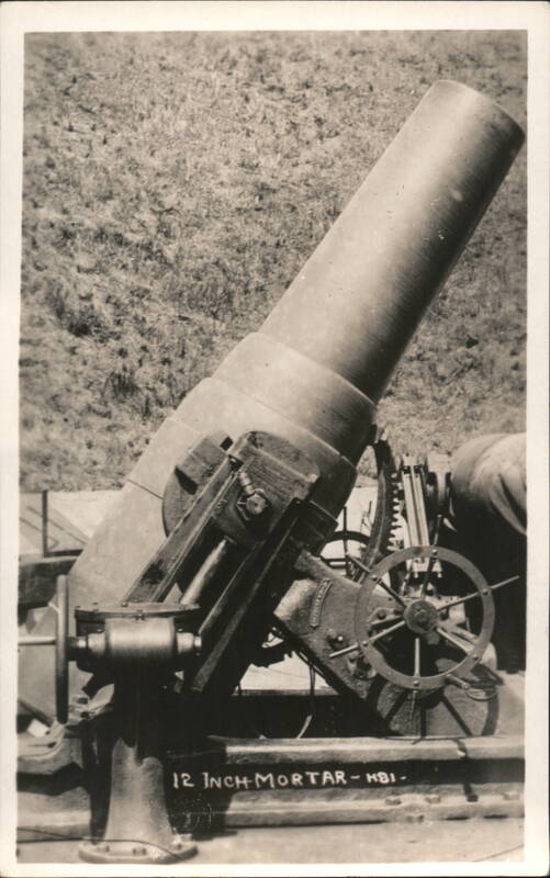 Close-up view of a large caliber 12-inch M81- mortar, highlighting its massive barrel, breech mechanism, elevation gear, and traverse wheel.