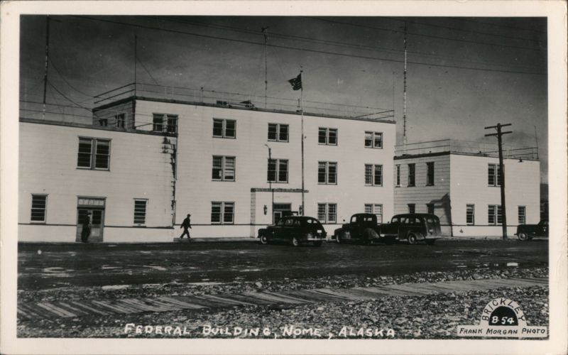 | View of the Federal Building in Nome, Alaska, with cars parked in front. Handwritten note on reverse describes Nome's population as about 1500 people (half white, half Eskimo), its history of disasters, Mayor Charles D. Jones, and the presence of the world's largest gold dredge. |