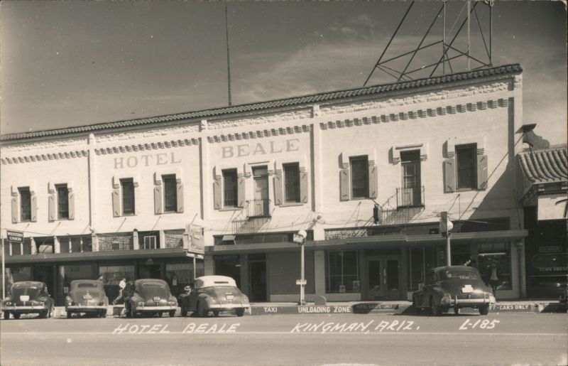Street view of the Hotel Beale with several automobiles from the 1940s era parked in front. Signs for Western Union, Taxi, and Unloading Zone are visible.