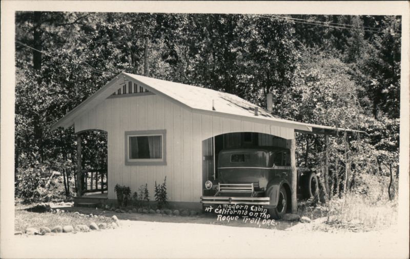 Small, light-colored cabin with an attached carport housing a dark-colored early model automobile. A sign in front reads 'A MODERN CABIN AT California on the Rogue Trail ORE.' The setting is wooded.