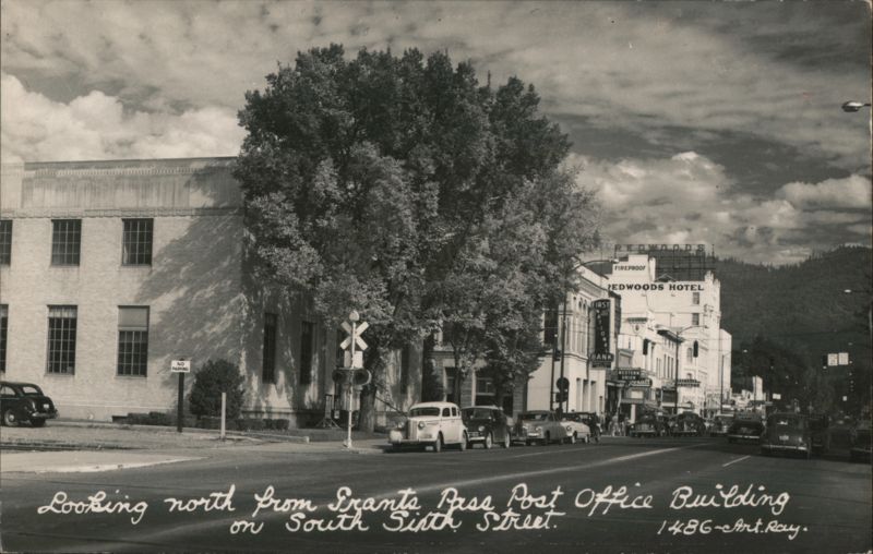 View looking north on South Sixth Street from the Grants Pass Post Office building. Cars are parked along the street, and the Redwoods Hotel is visible in the distance. A railroad crossing signal stands near the foreground.