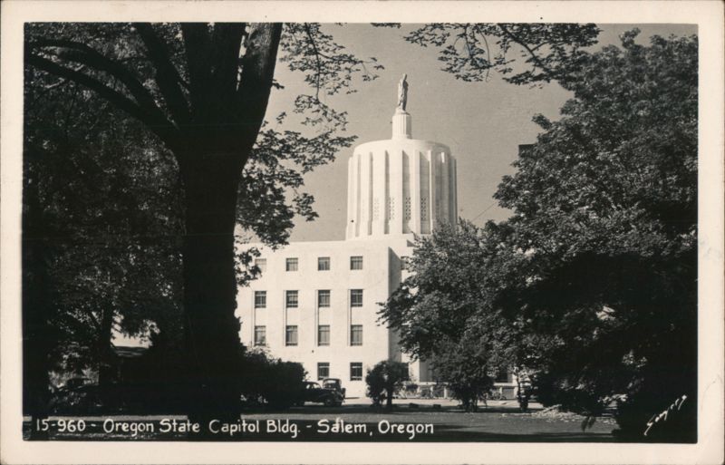 View of the Oregon State Capitol Building, notable for its modern architectural style and the prominent 'Oregon Pioneer' statue atop its dome.