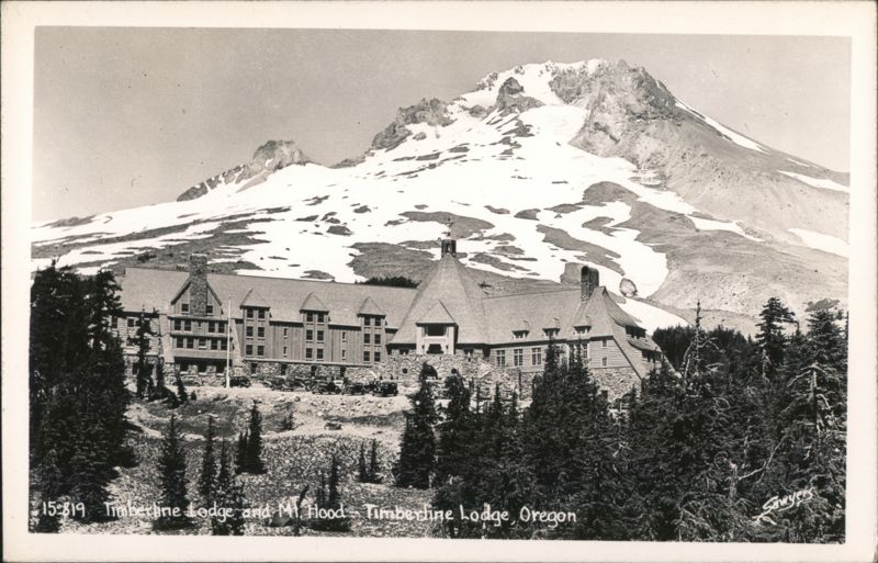 View of the historic Timberline Lodge with the snow-covered peak of Mt. Hood in the background.