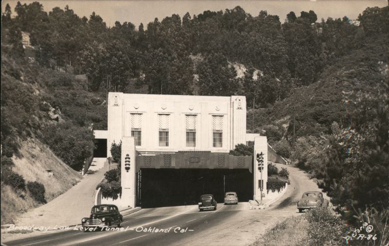 View of the Art Deco style entrance to the Broadway Low Level Tunnel in Oakland, California, with several automobiles from the era.