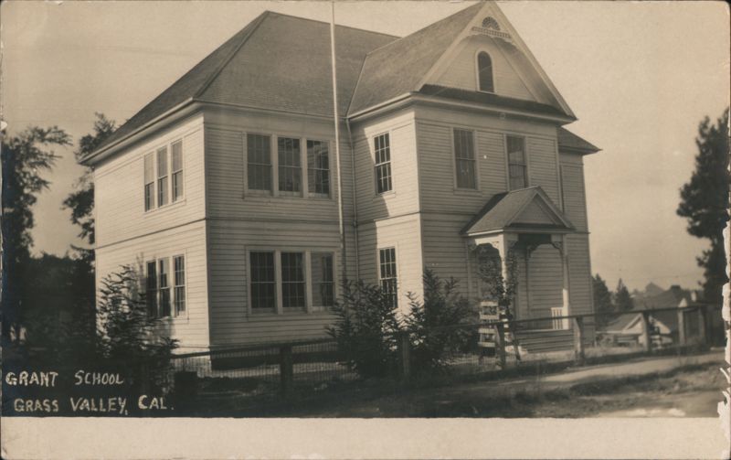 Exterior view of the two-story Grant School building with a prominent gable roof. A flagpole stands in front of the clapboard-sided structure, with a wooden fence and small evergreen trees in the foreground.