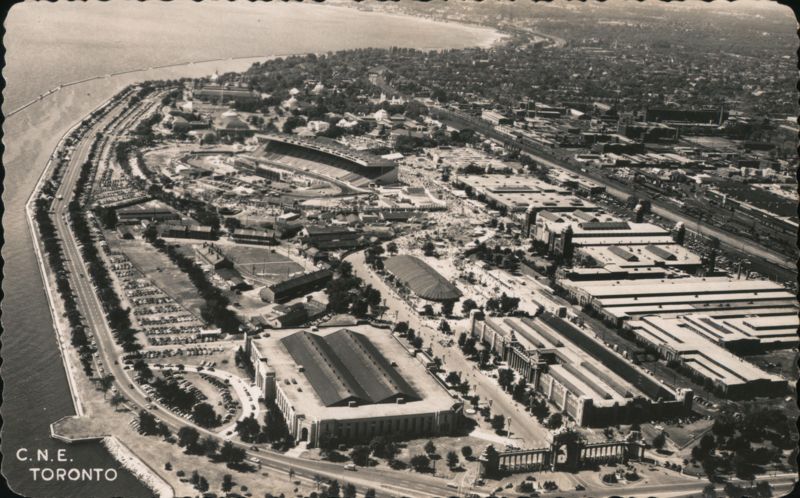 Shows the $3,000,000 Grand-Stand and Sports Field, Coliseum, and the Princes' Gates at the Canadian National Exhibition Park.