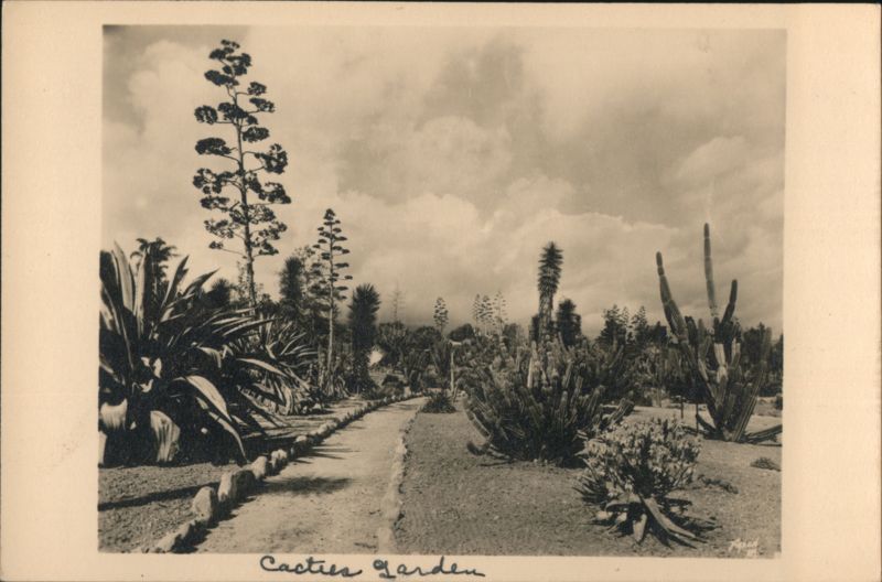 | Pathway in the 15-acre Cactus Garden at the Henry E. Huntington Library and Art Gallery, San Marino, California. The reverse describes the garden as holding the world's largest collection of cacti with 25,000 plants and 2,500 species. Cacti bloom in spring and summer; South African aloes provide winter color. |