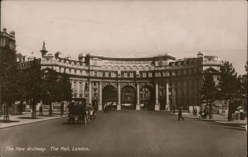 View of Admiralty Arch from The Mall, with early automobiles and a horse-drawn carriage. The arch's inscription reads: ANNO DECIMO EDWARDI SEPTIMI REGIS VICTORIAE REGINAE CIVES GRATISSIMI MDCCCCX.