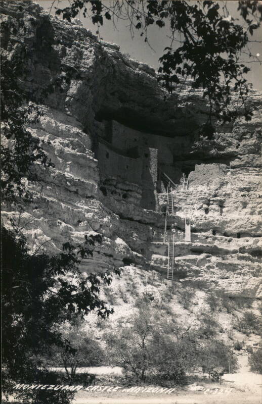 Cliff dwellings built into a limestone cliff face, with ladders providing access.